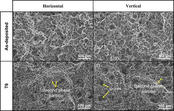 图12 7B55-Sc合金沉积态和T6热处理的断口形貌: (a) 沉积状态下的水平和 (b)竖直方向的断口形貌 (c) T6热处理状态下的水平和 (d) 竖直断口形貌