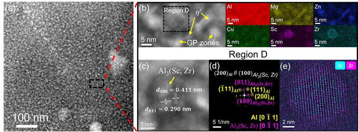 图9 7B55-Sc在T6热处理后晶内析出第二相的STEM结果: (a) 7B55-Sc合金在T6热处理后晶内STEM图像; (b) T6热处理之后的 η′ 相,GP区和次生Al3(Sc,Zr) 的HAADF-STEM图像和EDS图; (c, d) 区域D的放大图和次生Al3(Sc,Zr) 的FFT; (e) 次生Al3(Sc,Zr) 的壳核结构