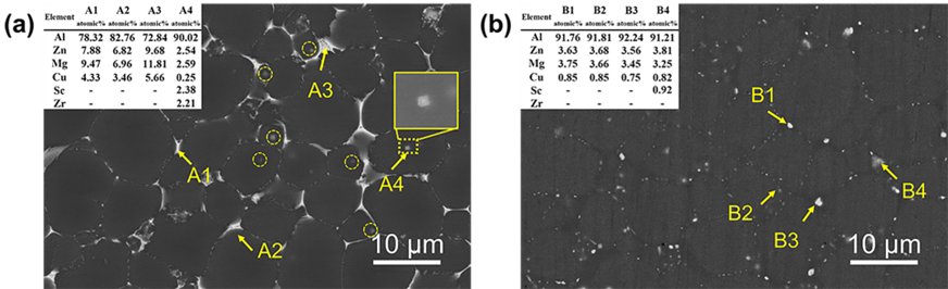 图6 7B55-Sc合金沉积态和T6热处理之后的BSE图像和点扫描结果: (a) 沉积状态 (b) T6热处理状态