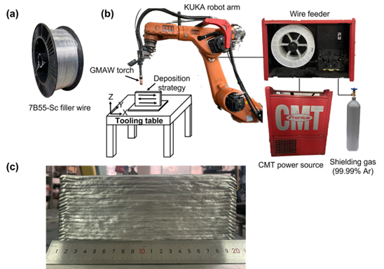 图1 (a) 7B55-Sc铝合金丝材; (b)WAAM系统; (c)无裂纹单道多层铝合金构件