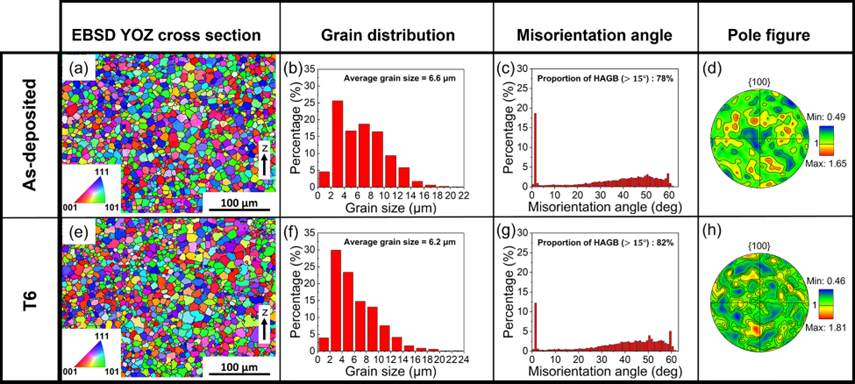 图4 7B55-Sc合金沉积态和T6热处理后的EBSD分析结果: (a, b, c, d) 沉积样品和 (e, f, g, h) T6热处理样品的EBSD IPF图、晶粒大小分布、晶界角分布和极图