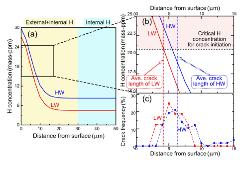 图4 ( a )裂纹萌生阶段在蒸馏水中暴露60 min后HW和LW中氢扩散的模拟结果,( b ) ( a )中黑色矩形标记区域内HW和LW的放大分布,( c )初始裂纹长度的分布。