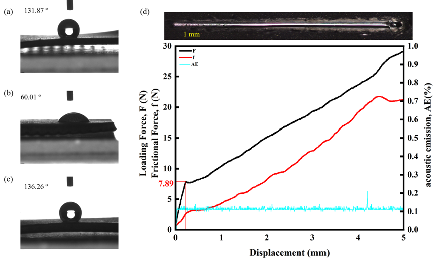 图 2(a)-(c) 不同镀层的接触角;(d):2:1 镀层样品的光学显微照片,以及在划痕试验中测得的加载力、摩擦力和声发射信号与距离的函数关系。