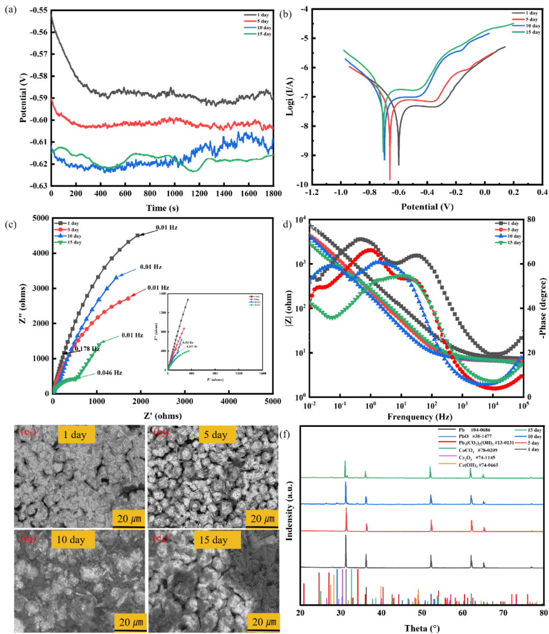 图 4 (a)-(f) 在渤海海水中浸泡不同天数后涂层的 OCP、极化曲线、奈奎斯特图、博德图、扫描电镜图像和 XRD 图样。