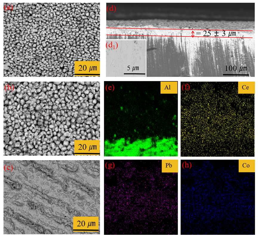 图1(a)-(c) 从不同 Ce3+ 和 Co2+ 比例的电镀溶液中获得的不同镀层的扫描电镜图像;(d) 2:1 镀层的扫描电镜图像截面图;(e)-(h) 镀层截面的相应元素分布。