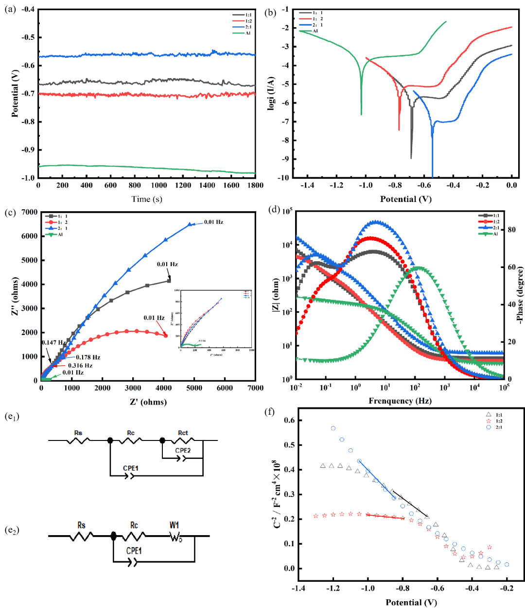 图 3 (a) 基底和不同比例涂层的 OCP,(b) 基底和不同比例涂层的极化曲线,(c) 基底和不同比例涂层的奈奎斯特图,(d) 基底和不同比例涂层的 Bode 图,(e) 用于拟合 EIS 数据的等效电路,以及 (f) 不同比例涂层的 Mott-Schottky 图。