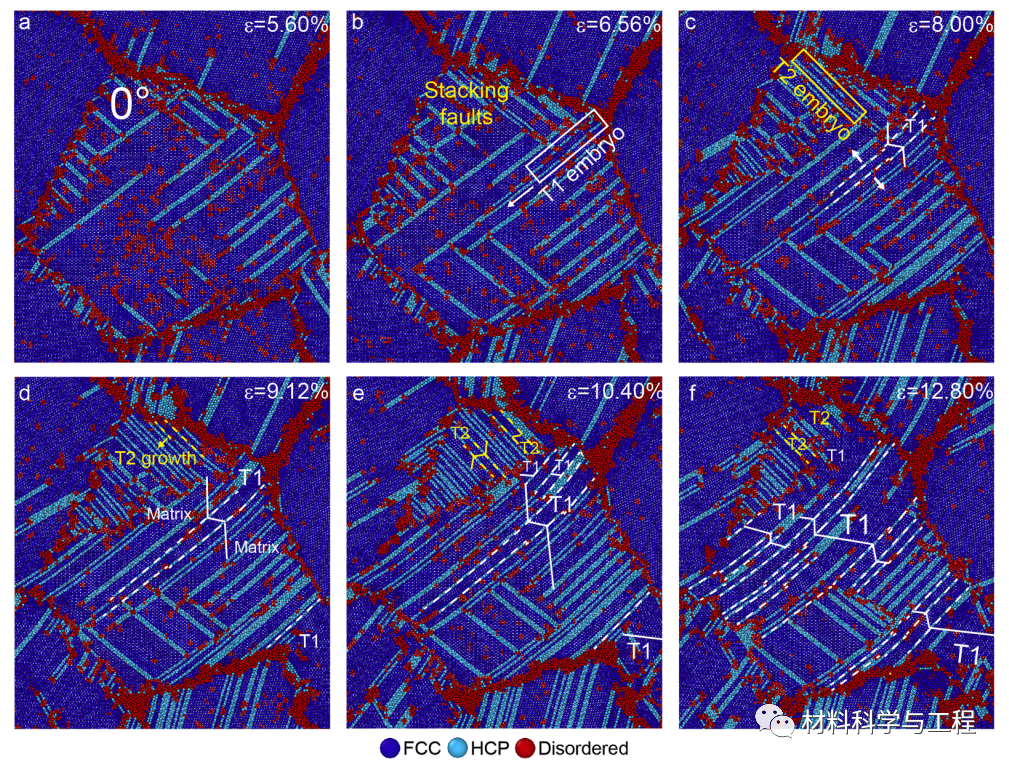 在过去的十年中,通过将接近等原子比(5%至35%)的多种元素(四种或更多)合金化到固溶体相中,提出并合成了一类新型合金,被称为高熵合金(HEA)。这种HEA策略打破了传统合金设计的局限性,大大拓宽了合金的设计空间。通过调整元素的成分或浓度,科学家可以调节 HEA 的微观结构,以进一步实现所需的机械性能。 HEA 表现出卓越的机械性能,如高强度、优异的延展性、高断裂韧性和良好的热稳定性。由于其独特的微观结构和化学成分,高熵合金(HEA)表现出卓越的机械性能,如高强度、优异的延展性和良好的热稳定性。然而,迄今为止,关于 HEA 动态行为的研究还很有限。来自北京理工大学和清华大学的学者通过结合力学测试和分子动力学模拟,系统地研究了CoCrFeNi HEA及其连接在动态加载下的力学行为和变形机制。对多晶CoCrFeNi HEA 样品在不同应变率下的压缩测试表明,屈服应力和流动应力均随应变率的增加而增加,并且由于HEA 的固溶强化和晶格畸变而表现出显着的应变率敏感性。 CoCrFeNi HEA 的应变率敏感性从低应变率 (5.0×10−5–2.5×103 s−1) 下的 0.010 转变为高应变率 (2.5×103–6.5×103s−1) 下的 0.333。大规模分子动力学模拟进一步揭示,这种转变与低应变率下的位错成核和滑移到高应变率下的大量位错成核和阻力的塑性变形机制转变有关。此外,CoCrFeNi HEA 在高应变率下表现出显着的应变硬化能力,这源于初级和次级纳米级孪晶以及孪生孪生和孪生位错相互作用的形成。我们目前的研究揭示了动态载荷下 HEA 的塑性变形机制,为设计和制造具有优异动态机械性能的 HEA 提供了指导。相关工作以题为“Dynamic deformation behaviors and mechanisms of CoCrFeNi high-entropy alloys”的研究性文章发表在Acta Materialia。图 1. CoCrFeNi HEA 块体的微观结构表征。 (a) HE-XRD 图案。 (b) 块状 CoCrFeNi HEA 的 EBSD 图图 2. CoCrFeNi HEA 在不同应变率下的单轴压缩行为。 (a) 不同应变率下的真应力-真应变曲线。 (b) 5%应变下屈服应力和流动应力随应变率的变化。 Al、Ni 和 Cu的数据用于比较。 (c) 不同应变下的流动应力随应变率的变化。 (d) 应变硬化率随真实应变的变化。图 3. CoCrFeNi在不同应变速率下变形后的显微组织。 (a, b) CoCrFeNi HEA 在真实应变为 16.2% 和 28.8%、应变率为 1×10−3 s−1时的 EBSD 图。 (c, d) CoCrFeNi HEA 在真实应变为 16.2% 和28.8%、应变率为 4.5×103 s−1时的EBSD 图。变形孪晶产生的孪晶边界呈蓝色。 (e) CoCrFeNi HEA 在不同应变率下真应变为 28.8% 时的取向差角分布。图 4. CoCrFeNi HEA 的 TEM 图像,在应变率为4.5×103 s−1时,真实应变为 28.8%。(a, b) 变形 HEA 中的双束。 (b) 中的插图显示了孪晶结构的选定区域电子衍射图案。图 5. MD 模拟中 CoCrFeNi HEA 的单轴压缩。 (a) 具有 4 个晶粒的模拟多晶样品的初始原子构型。 (b) 模拟样品在不同应变率下的应力-应变曲线。 (c, d) 屈服应力和流动应力随应变率的变化。 (e) 应变率为 15.0%、应变率为 2×107 s−1时模拟样品的原子构型。 (e) 应变率为 15.2%、应变率为8×109 s−1时模拟样品的原子构型。白色虚线表示多个纳米级孪晶的孪晶边界。白色实线表示矩阵和孪晶域中的原子排列。图 6. 模拟样品在不同应变率下变形过程中的位错演化。 (a-c) 应变率为 2×107 s−1 时模拟样品中位错分布的一系列快照。 (d-f) 应变率为 8×109 s−1时模拟样品中位错分布的一系列快照。 (g) 在不同应变率下施加应变时位错密度的演变。图 7. 移动位错密度和平均位错速度随应变率的变化。图 8. CoCrFeNi HEA 在不同应变率下真实应变为 16.2% 的肯尔平均取向误差 (KAM) 图。 (a) 应变率为1×10−3 s−1时 CoCrFeNi HEA 的 KAM 图。 (b) 应变率为4.5×103 s−1时 CoCrFeNi HEA 的 KAM 图。高角度晶界以黑线显示。图 9. 根据 MD 模拟,在应变率为 8×109 s−1的变形样品中形成分层孪晶。 (a) 晶界的位错发射。 (b-c) 初级孪晶 (T1) 的成核和生长。 (d-e) 二次双胞胎 (T2) 的成核和生长。 (f) 主要双胞胎和次要双胞胎之间的相互作用。白色和黄色分别代表主要和次要双胞胎。总之,本研究通过准静态/动态压缩测试研究了 CoCrFeNi HEA 在应变率范围从 5.0×10−5 s−1到 6.5×103 s−1的变形行为和相关机制。本研究还进行了 MD 模拟来补充实验并揭示潜在的变形机制。实验结果表明,随着应变速率的增加,多晶CoCrFeNi HEA的屈服应力和流动应力均显着增加。 5%应变下的流变应力的SRS从低应变率下的0.010转变为高应变率(2.5×103–6.5×103s−1)下的0.333 。实验分析和MD模拟相结合表明,这种SRS转变归因于从低应变率下的位错成核和滑移到高应变率下的大量位错成核和位错阻力的变形机制转变。此外,在高应变速率下,CoCrFeNi HEA 的应变硬化速率随应变的变化存在一个平台,表明高应变速率下具有显着的应变硬化能力。这种显着的应变硬化源于初级和次级纳米级孪晶以及孪生和孪生位错相互作用的成核和延伸。本研究结果提供了动态载荷下 HEA 塑性变形的机制见解。