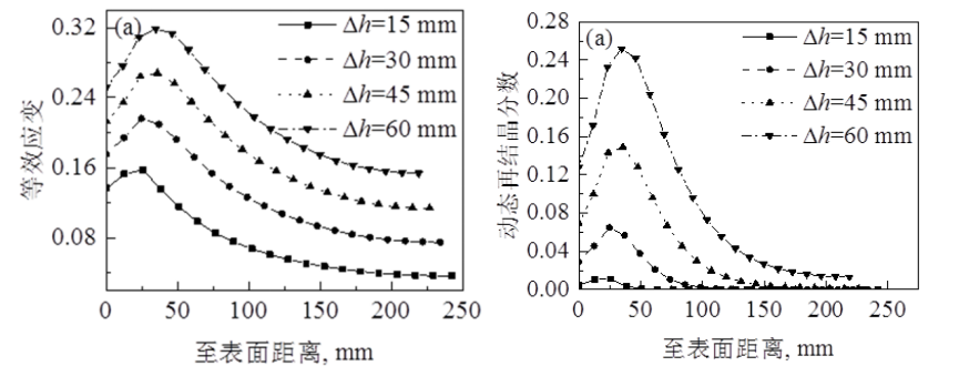 (a)压下量对厚度方向等效应变的影响 (b)压下量对厚度方向再结晶分数的影响