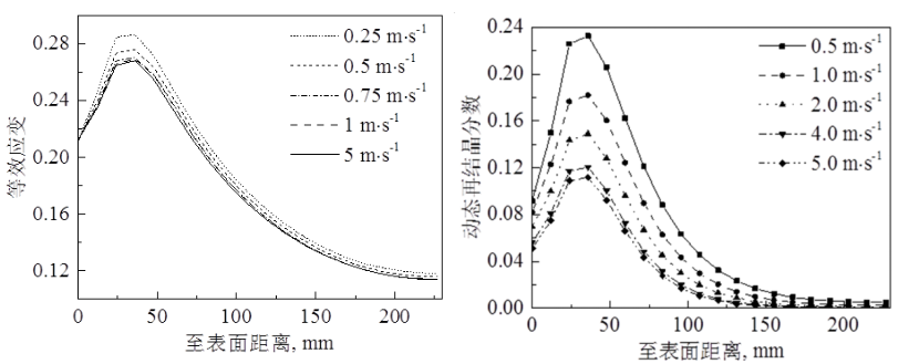 (a)轧制速度对厚度方向等效应变的影响 (b)轧制速度对厚度方向再结晶分数的影响