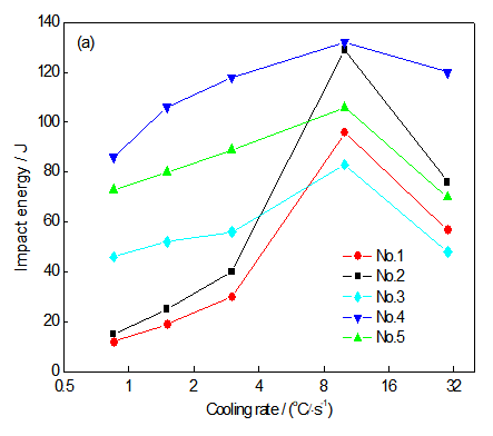 本项目研究了实验钢随着淬火温度的升高,其抗拉强度、屈服强度和低温冲击功先升高而后降低;在900℃左右达到最高值,高于或低于这一温度,强度和韧性都有所降低,且韧性变化更为明显;而且随奥氏体化温度的升高,屈强比先升后降,在900℃左右达到峰值,如图5所示。