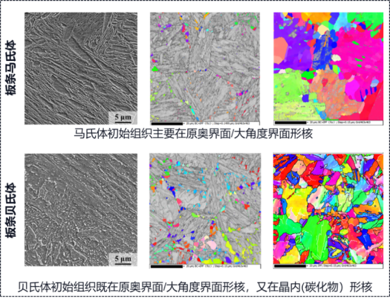 研究了奥氏体组织细化机理,如图6,揭示了初始组织对奥氏体形核的影响,提高大角度界面和碳化物密度可促进奥氏体形核,细化原始奥氏体尺寸。