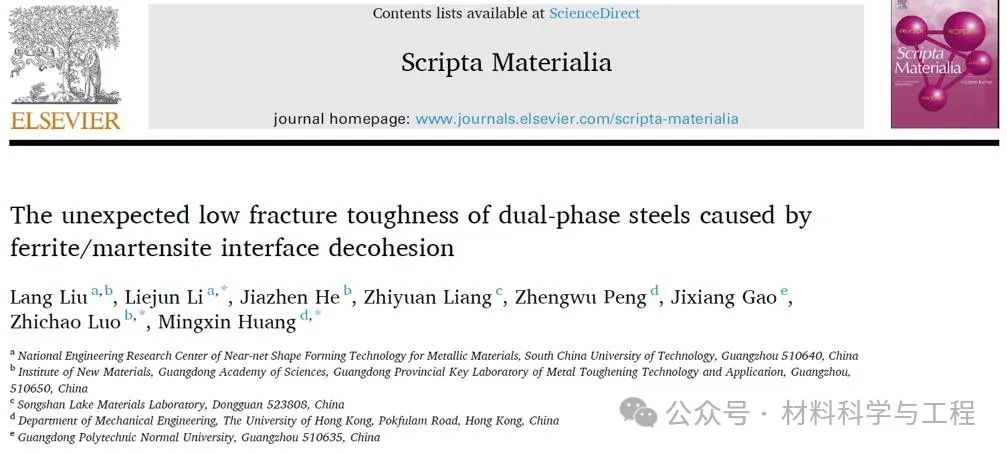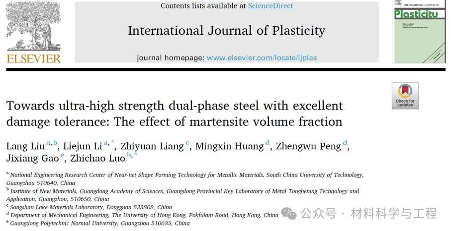 相关工作分别以题为“Towards ultra-high strength dual-phase steel with excellent damage tolerance: The effect of martensite volume fraction”和“The unexpected low fracture toughness of dual-phase steels caused by ferrite/martensite interface decohesion”的文章发表在《International Journal of Plasticity》和《Scripta Materialia》上,论文的第一作者是华南理工大学博士研究生刘浪。