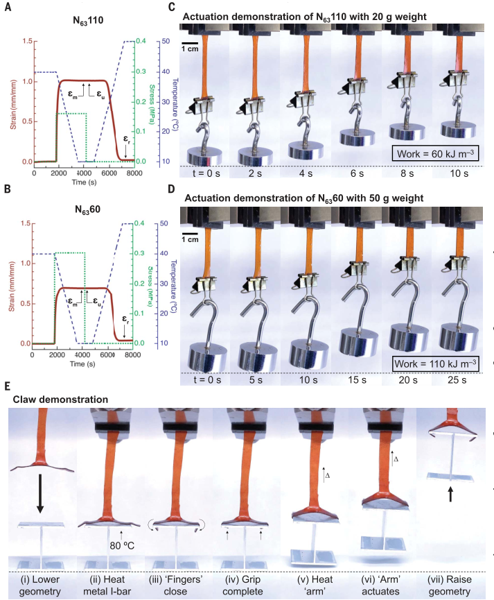 这项工作的创新之处在于描述了一种设计动态共价聚合物网络材料的策略,该材料利用动态网络和相分离之间的协同关系,只需简单地改变回火温度,材料即可实现多样的材料性能。材料同时具有形状记忆特性,通过对材料形状因子和编程的仔细控制可以控制材料响应。材料不仅可以通过控制回火而获得需要的被动性能,而且还可以合理设计以创造适应性强的多功能材料。