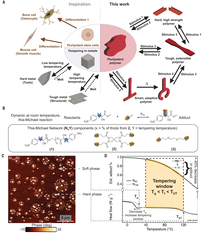 近期来自芝加哥大学的Stuart J. Rowan团队将一种单一的聚合物网络进行回火等系列热调节动作,成功开发出来具有不同力学特性的聚合物材料。其功能类似于干细胞概念,能够从单一的聚合物材料通过简单的温度条件分化为具有多种机械性能的多能聚合物材料,例如从硬、脆、软到柔性等性能。这种方法是通过包含thia-Michael键实现的,与聚合物中的共价键相比,thia-Michael键相对较弱,并能在较低温度下重新排列。在较高的回火温度下,thia-Michael网络的交联密度会降低,导致材料的刚度降低,而在较低的温度下回火则会产生更硬的材料。这种材料之所以具有形状记忆特性,是因为结合交联和非结合交联的变化导致了动态反应引起的相分离。该研究近期发表在Science上,引起了不小的轰动。