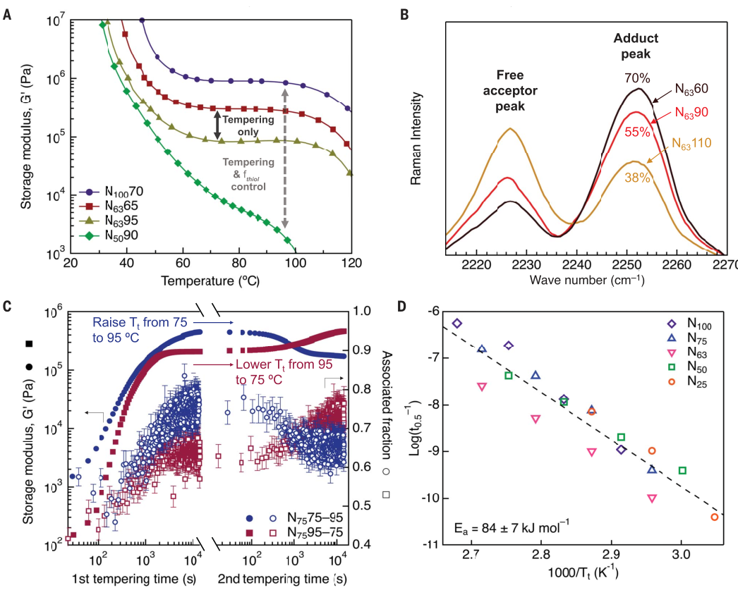 研究者结合可重构键的存在、动态键在回火窗口内的热敏性,以及室温下回火性能的稳定性,采用thia-Michael网络作为探索合成材料回火的原型系统。考虑到N63的室温操作窗口和较大的G′(温度相关存储模量)变化,作者选择N63来进一步研究NxY薄膜回火的潜在机制。实验证明了在特定操作温度下(本研究为室温)回火机械性能的能力,即在不进行何化学修饰的情况下轻松地在这些性能之间切换,并将回火性能保留一个多月。