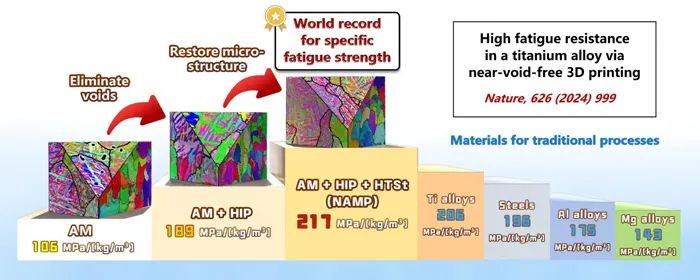 近期,中国科学院金属研究所材料疲劳与断裂团队带头人张哲峰研究员在前期疲劳损伤机制和疲劳预测理论指导下,与轻质高强材料研究部杨锐研究员团队开展合作,在3D打印钛合金抗疲劳设计制备方面取得了突破性进展,制备出具有优异疲劳性能的3D打印钛合金材料。该项研究成果于2024年2月29日以题为“High fatigue resistance in a titanium alloy via near void-free 3D printing”发表在Nature杂志上,金属所博士研究生曲展为论文第一作者,张振军研究员、美国加州大学伯克利分校Robert O. Ritchie教授、张哲峰研究员为论文通讯作者。