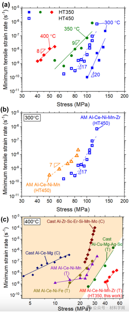 图 5. Al-Ce-Ni-Mn-Zr 合金 (a) 在 300、350 和 400 °C 时的最小蠕变应变率与应力的双对数图。(b) 300 °C 时与 Al-Ce-Ni-Mn 合金的比较,以及 (c) 400 °C 时与其他现有铸造或 AM Al 合金在拉伸 (T) 或压缩 (C) 条件下的数据比较,包括 AM Al-Ce-Ni-Mn、AM Al-Ce-Ni-Fe、铸造 Al-Ce-Mg、铸造 Al-Zr-Sc-Er-Si-Mn-Mo,以及铸造 Al-Cu-Mg-Ag-Sc。