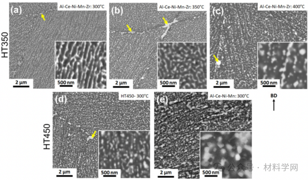 图 6. 在 HT350 条件下于 (a) 300°C、(b) 350°C 和 (c) 400°C 蠕变的 Al-Ce-Ni-Mn-Zr 合金,以及 (d) 在 HT450 条件下于 300°C 蠕变的 Al-Ce-Ni-Mn-Zr 和 (e) Al-Ce-Ni-Mn 合金的 BSE-SEM 显微,显示 (a) 第二相的连续网络和 (b-e) 变粗的不连续分散体。位于晶界的第二相颗粒由黄色箭头标出。