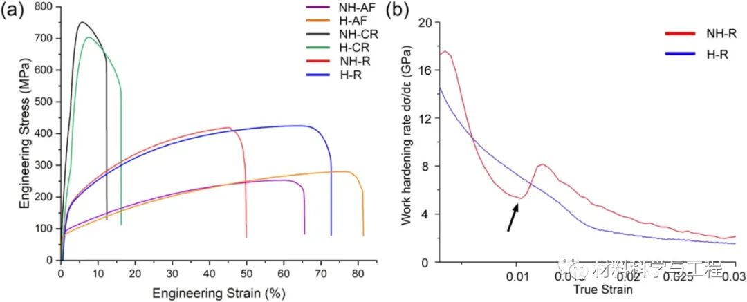 图2(a)六种样品的典型工程拉伸应力-应变曲线,(b)NH-R和HR样品的应变硬化率。