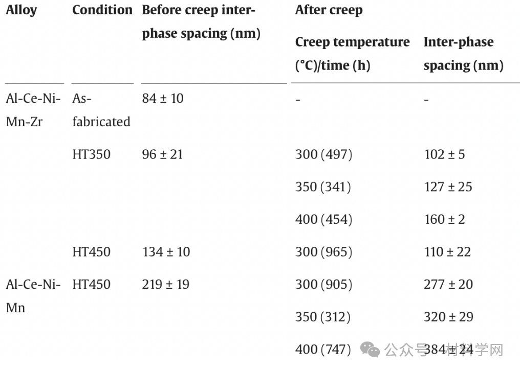 表 1. 使用 ImageJ 测量的 Al-Ce-Ni-Mn-Zr 和 Al-Ce-Ni-Mn 合金在不同老化/蠕变条件下的相间间距汇总。所提供的平均值 ± 标准偏差是多幅 SEM 图像的平均值。请注意,为了保持一致,使用与 Al-Ce-Ni-Mn-Zr 合金相同的技术对 Al-Ce-Ni-Mn-Mn 合金的相间间距进行了重新测量,因此预计与参考文献中之前报告的数值存在差异。