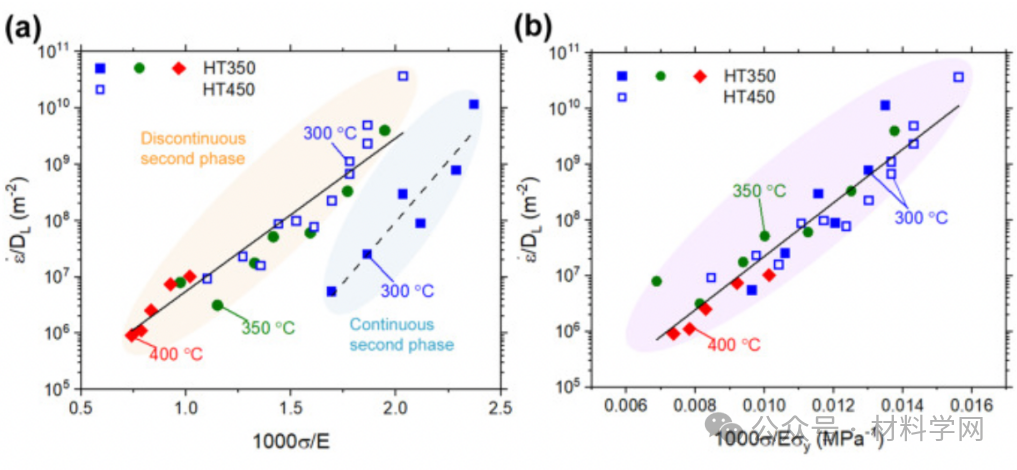 图 10. 说明蠕变变形机制的原位蠕变数据。(a) 扩散补偿应变速率与模量补偿应力的关系图,根据不连续(橙色突出显示)或连续第二相微结构(蓝色突出显示)来区分蠕变行为。(b) 由于变形机制的类型也会影响屈服强度,当施加的应力与屈服强度进一步归一化时,所有的蠕变数据都归结为一条曲线。