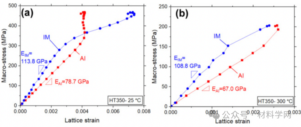图 8. HT350 Al-Ce-Ni-Mn-Zr 合金在 (a) R.T.和 (b) 300°C 原位中子拉伸试验中的宏观应力与晶格应变关系图。各相在弹性加载区域的斜率为相应的衍射弹性常数。IM 代表 Al27Ni6Ce3 金属间相。