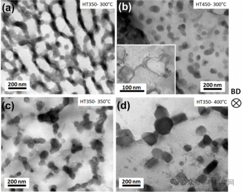 图 7. Al-Ce-Ni-Mn-Zr 合金在 (a) HT350 和 (b) HT450 条件下蠕变后的亮场 STEM 图像(插图显示的是刻面分散体),蠕变温度为 300°C;HT350 条件下蠕变温度为 (c) 350°C 和 (d)400°C。HT350 中的第二相连续性在 300°C 蠕变后保持不变,但在 350°C 蠕变后部分断裂,在 400°C 蠕变后完全断裂。