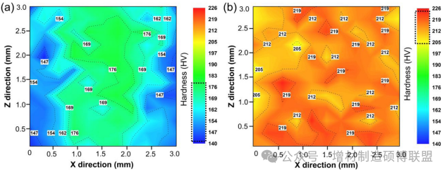 图8. 沉积状态标本(a)和经热处理标本(b)的微观硬度。