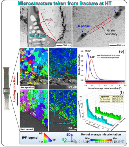图15. 沉积状态标本(a)和经热处理标本(b)的透射电子显微镜(TEM)的亮场图;从沉积状态标本(c)和经热处理标本(d)的断口处获取的电子背散射显微镜(EBSD)生成的逆极图(IPF)和KAM图,HT表示高温;(e) 沉积状态标本和经热处理标本的KAM分布;(f) 沉积状态标本和经热处理标本的晶界错配角分布。