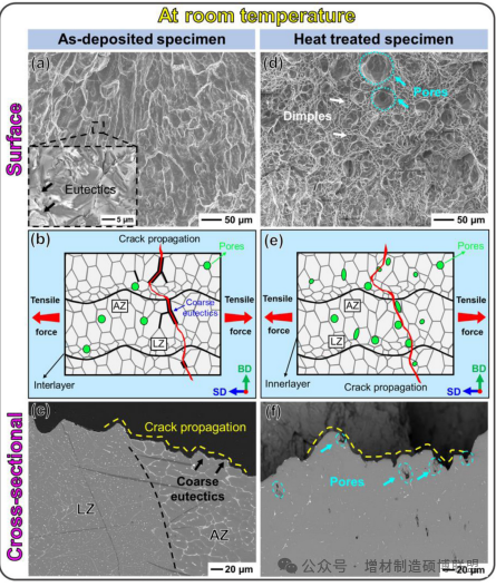 图13. 室温下测试的沉积状态标本的断口表面(a),裂纹传播路径的示意图(b)和横截面视图(c);经热处理标本的断口表面(d),裂纹传播路径的示意图(e)和横截面视图(f)。