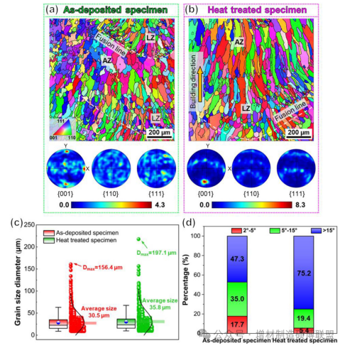 图3. 沉积状态标本(a)和经热处理标本(b)的反极图(IPF)和极图(PF);(c)晶粒尺寸分布;(d)晶界错配角百分比。
