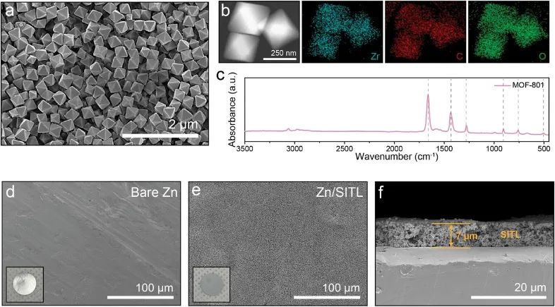 为探讨选择性离子传输层(SITL)的孔径对电解质中离子运动的影响,测量了MOF-801纳米粒子的比表面积和孔径分布。结果表明其结构以微孔为主,孔径为6.0 Å(图2a)。通过在锌金属阳极表面均匀涂覆SITL,形成了稳定的4.30 Å大小的水合锌离子通道,有效抑制了锌枝晶的形成(图2b)。6.0 Å孔径的SITL成功阻止了VO2+的迁移,从而有效地预防了锌金属阳极的腐蚀。通过H-cell验证了SITL阻挡了钒离子。