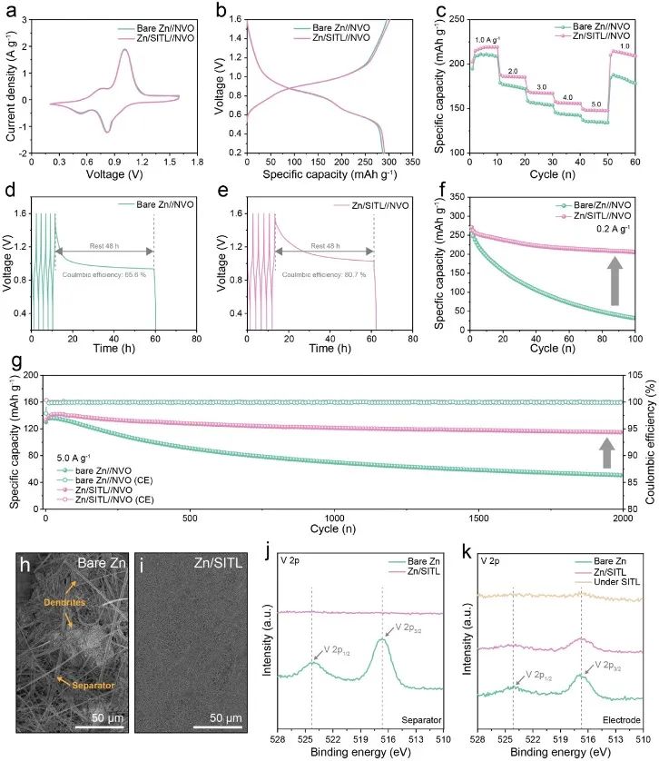 图5 a) 0.5 mV/s下的CV曲线;b) 0.1 A/g下的恒流充放电曲线;c) 裸Zn//NVO和Zn/SITL//NVO全电池在不同电流密度下的倍率性能;d) 裸Zn//NVO和 e) Zn/SITL//NVO的自放电曲线;f) 0.2 A/g下的循环稳定性测试;g) 5.0 A/g下的长期循环稳定性测试;h,i) 经过2000次循环稳定性测试后的裸Zn和Zn/SITL的表面SEM图;j) 隔膜和 k) 阳极在全电池循环稳定性测试后的V 2p XPS光谱