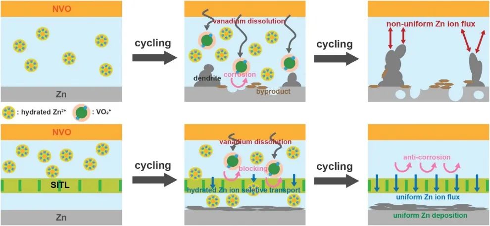 正如图6所示,当钒离子从阴极释放出来时,由于副反应会导致锌电极腐蚀,造成锌枝晶生长和氢还原反应。这些过程促进了钒的进一步溶解,导致整个电池性能明显下降。然而,SITL不仅可以抑制腐蚀和枝晶的生长,而且还能有效防止钒的溶解。这是因为SITL存在时,锌离子得以通过均匀的通道,而钒离子被阻挡。因此,SITL的引入显著提高了水性锌离子电池的电化学性能和循环稳定性。