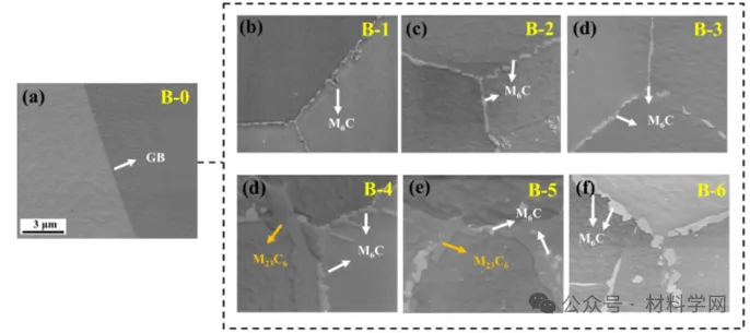 图3 SEM图像显示,在1123 K退火后,B组样品中金属碳化物在晶界处逐渐析出,作为函数时间,范围为1 h至744 h。基于这些图像,M[数学处理错误] C首先在1123 K(b)退火1 h后在GB形成。随着退火时间延长至72 h (c),越来越多的碳化物装饰了GB。然而,新阶段的M23C[数学处理错误]当C-22合金退火168 h(d)时被捕获,并且这个新相随着退火时间长达336 h(e)而不断增长。为溶液化样品(B-0)显示的比例尺也适用于图像(b-f)。