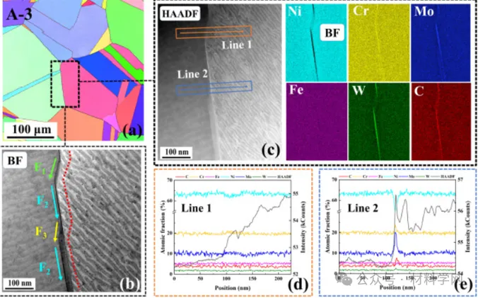 图2 A-3样品的微观结构:(a)A-3样品选定区域的低放大倍率EBSD图像和(b)图(a)中用黑色方块标记的相关区域的高放大倍率明场显微照片。所选 HAGB 的 STEM HAADF 显微照片以及该 GB 的相应 STEM EDS 元素图如 (c) 所示,相关的线扫描轮廓如 (d,e) 所示。