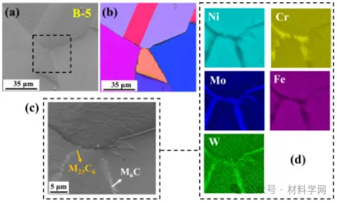 图5 在1123 K下退火336 h的C-22合金的EBSD分析(样品B-5)。(a)BSE图像和(b)同一区域对应的EBSD晶粒取向图,用黑线突出显示高角度晶界,(c)标示位置的放大BSE图像,如(a)所示,(d)对应的EDS图显示了这两种沉淀物的不同组成,一个富含Mo和W原子,另一种沉淀物显示 Cr 的富集和 Fe 的消耗。