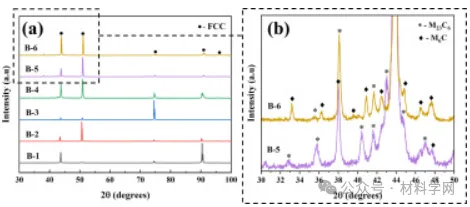 图4 (a) C-22合金的X射线衍射图谱(b)慢速扫描的XRD图谱显示长时间退火后存在金属碳化物。