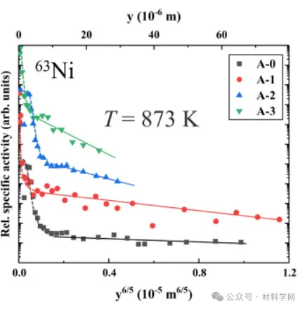 图8 在C型动力学状态(在573 K下扩散退火72小时)条件下测定的具有不同热暴露时间的C-22合金A组(a)组和B组(b)样品中63Ni扩散的放射性示踪剂渗透曲线。[数学处理错误]是穿透深度,实线表示拟合的晶界扩散分支。合金标签在表2中进行了说明。