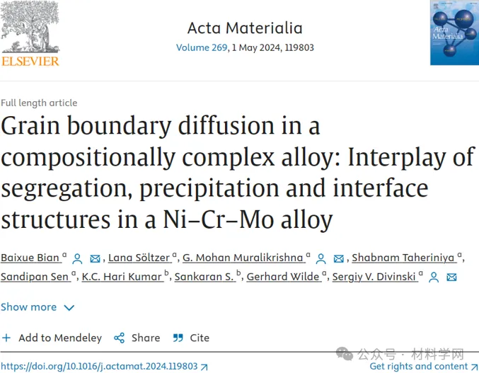 相关研究成果以题“Grain boundary diffusion in a compositionally complex alloy: Interplay of segregation, precipitation and interface structures in a Ni-Cr-Mo alloy”发表在国际期刊Acta Materialia上。