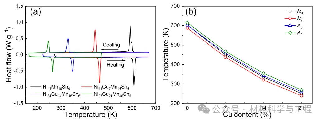 图 1. (a) 电弧熔化 Ni48-xCuxMn46Sn6(x = 0、7、14 和 21)合金的 DSC 曲线演示。(b)随铜含量变化的马氏体转变温度(Ms、Mf、As 和 Af)。