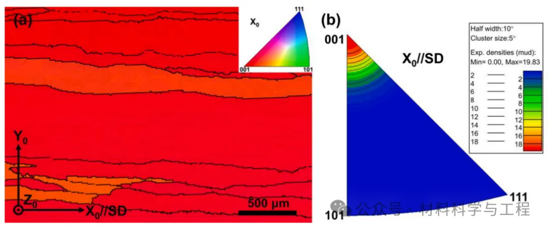 图 4. (a) 定向凝固的 Ni27Cu21Mn46Sn6合金的室温 EBSD 方向图(IPF 对比)。插图中显示了相应的 IPF 图例。(b) 根据 EBSD 测量结果绘制的 SD 逆极图。