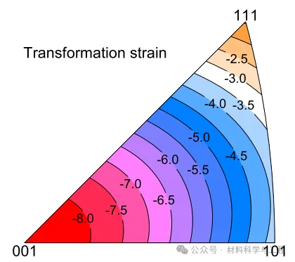 图 8. 根据 Ni27Cu21Mn46Sn6合金两相之间的 OR 预测的压缩变形应变与方向有关的轮廓。
