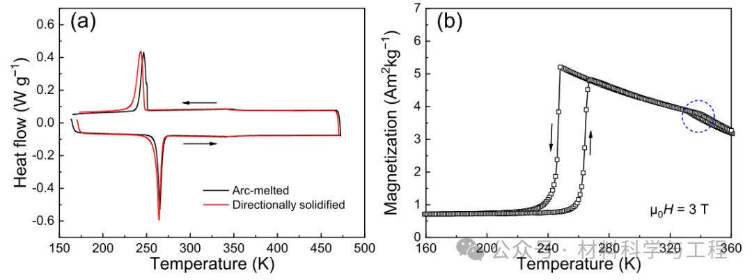 图 2. (a) 电弧熔化和定向凝固 Ni27Cu21Mn46Sn6合金的 DSC 曲线。(b) 定向凝固的 Ni27Cu21Mn46Sn6 合金在 3 T 磁场下磁化的温度依赖性。