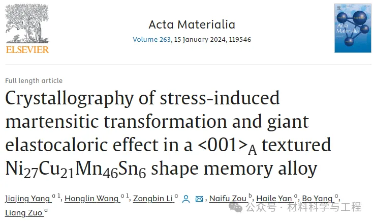 这项研究有望深入揭示应力诱导的马氏体转变结晶学,并为设计高性能弹性材料提供一些启发。相关工作以题为“Crystallography of Stress-induced martensitic transformation and giant elastocaloric effect in a <001>A textured Ni27Cu21Mn46Sn6 shape memory alloy”的研究性文章发表在Acta Materialia 。