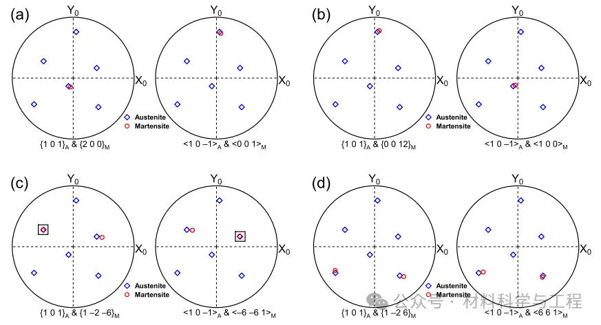 图 7. 根据 EBSD 测量确定的结晶取向计算的奥氏体和应力诱导的 6 M 马氏体之间各种假定 OR 下的特征结晶平面和方向的极值图。(a) {1 0 1}A // {2 0 0}M 和 <1 0 -1>A // <0 0 1>M. (b) {1 0 1}A// {0 0 12}M 和 <1 0 -1>A // <1 0 0>M. (c) {1 0 1}A // {1 -2 -6}M 和 <1 0 -1>A // <-6 -6 1>M. (d) {1 0 1}A // {1 -2 6}M 和 <1 0 -1>A// <6 6 1>M。