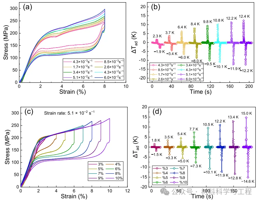 图 9. (a) 在室温(300 K)下测量的固定应变 8%、不同应变率下的压缩应力-应变曲线。 (b) 固定压缩应变 8%、不同应变率下的应力-温度变化。(c) 在不同压缩应变下,加载/卸载速率为 5.1 × 10-2 s-1 时的应力-应变曲线。(d) 在 5.1 × 10-2s-1 的恒定应变速率下,各种外部应变引起的应力-温度变化。