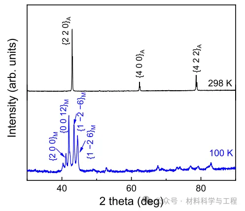 图 3. 使用粉末样品在 298 K 和 100 K 条件下测量的定向凝固Ni27Cu21Mn46Sn6 合金的 XRD 图谱。