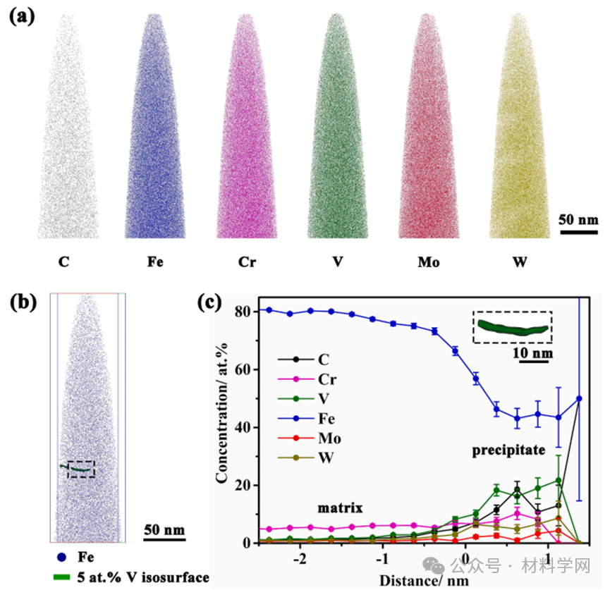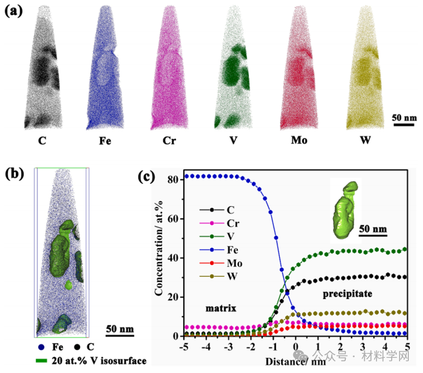 图6所示。回火状态APT分析:(a)选定元素原子图;(b) V的原子图和10 at的等浓度面。% V;(c)从所选颗粒穿过基体-碳化物界面的接近直方图(如图所示)。