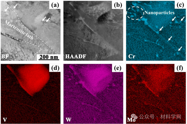图10所示。(a) STEM亮场(BF)图像和(b)显示纳米颗粒存在的高角度环形暗场(HAADF)图像;(c) - (f) STEM-EDS Cr、V、W、Mo元素映射,确认富Cr特征。